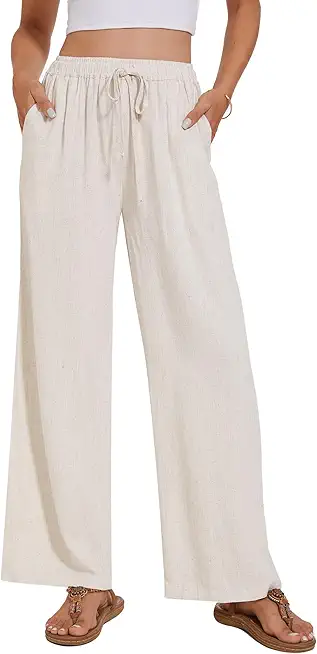 High-waist linen pants with pockets and adjustable drawstrings offer practicality and a flattering fit.