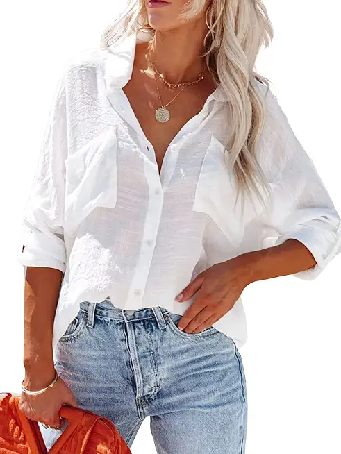 Breezy Lane’s Button-Down Coverup in white (30x27 in., 0.35 lbs) is a long-sleeve cotton/rayon blouse for S-4XL. Ideal for swimsuit cover or casual outings. Machine-washable. 1-year warranty.